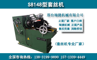 河北省邢臺市瑞捷機械設備公司,創建于2003年,坐落在全國的機械制之鄉-邢家灣工業區。本廠專業制造套絲機,TS80型套絲機,TS64型套絲機,TS50型套絲機,螺栓套絲機,S8139型套絲機,S8148型套絲機圓鋼/圓管套絲機及切線板牙頭等配套產品。